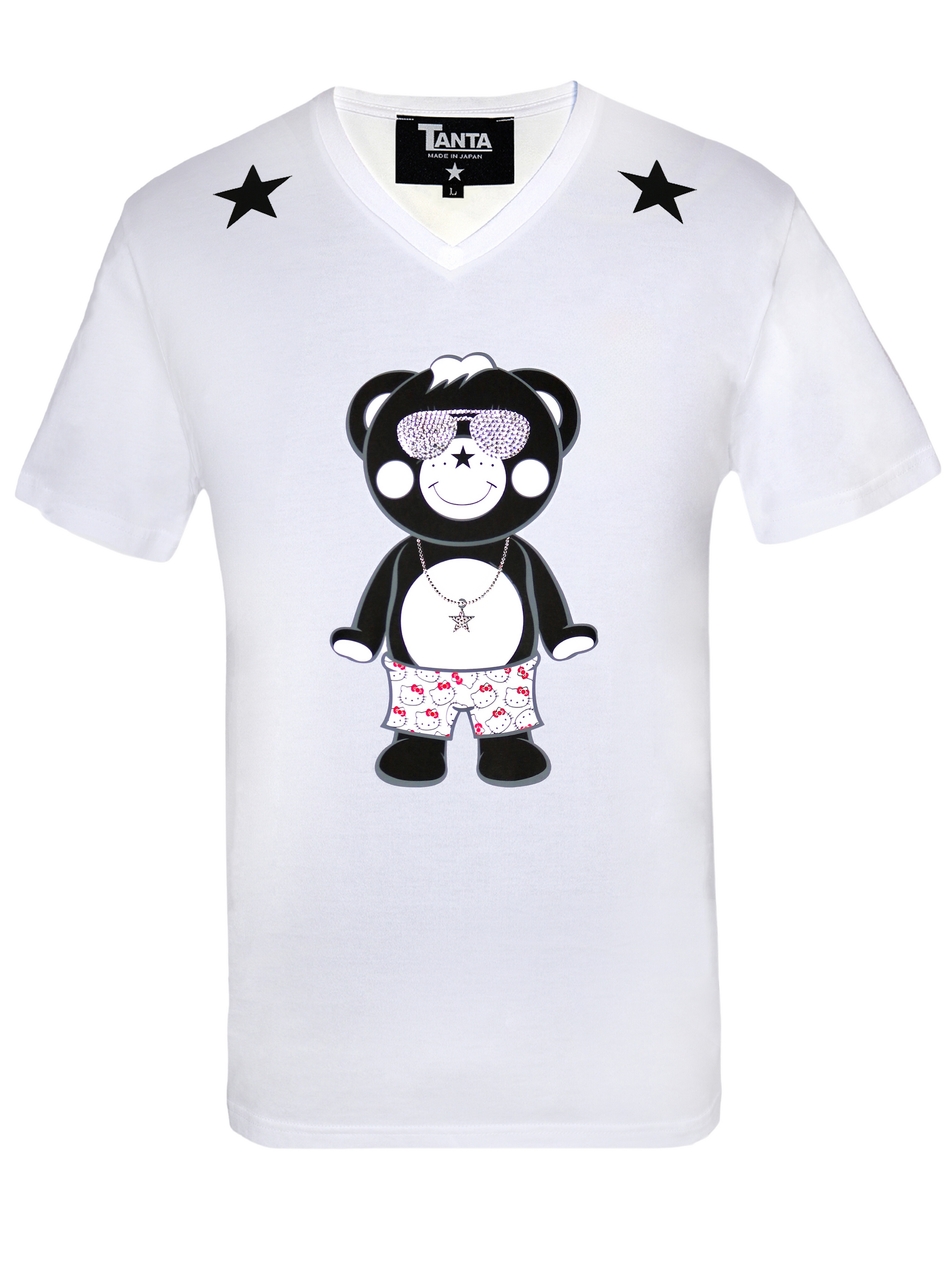 ブランドアイコン「チャッピー」が、日本の可愛いアイコンハローキティーがモノグラムになってるSurf Shortsを履いてる可愛くて面白いデザイン。肩とバックの★プリントもポイント。デザインのインパクトだけでなく、伸縮性があり肌触りの良い高級な100%コットン素材(PARVATI®)を使用した着心地が抜群、Vネックの可愛いTシャツ。